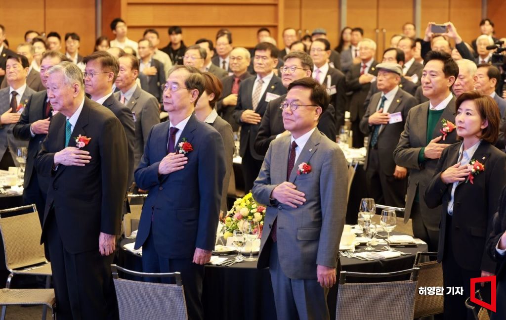 제19대 대한노인회장으로 선출된 이중근 회장의 취임식이 21일 서울 대한상공회의소에서 열렸다. 이 회장과 한덕수 국무총리, 오세훈 서울시장 등 참석자들이 국민의례를 하고 있다.