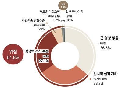 구체적으로 '일시적 실적 저하(28.8%)'와 '경쟁력 저하(27.1%)'를 주로 겪고 있으며, 5.9%는 '사업존속 위협'까지 체감하는 것으로 조사됐다. 반면 지정학적 리스크가 '긍정적 요인'으로 작용한 기업(1.8%)도 있다.