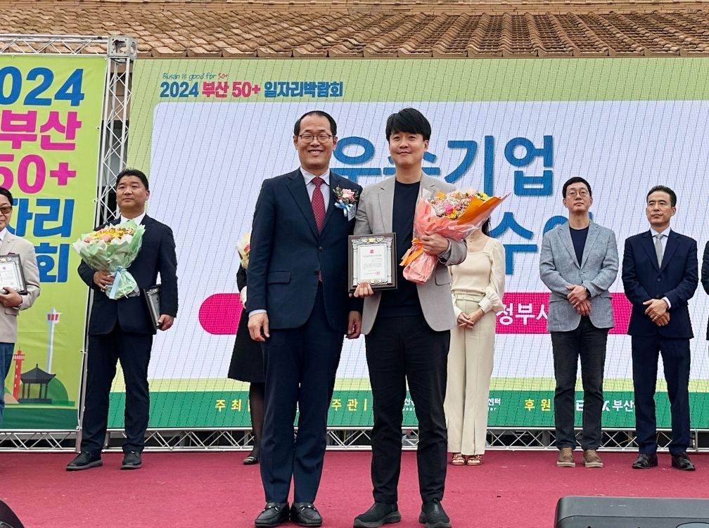 (사진 왼쪽부터)이준승 부산광역시 행정부시장과 박성복 케어링 부대표가 시니어일자리 창출 우수기업 인증서 수여식에서 기념 촬영을 하고 있다.