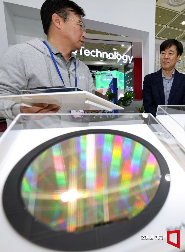 23일 서울 강남구 코엑스에서 열린 반도체대전(SEDEX·Semiconductor Exhibition 2024)에서 관람객들이 반도체 설계 전문업체인 세미파이브에서 전시한 반도체칩 등을 살펴보고 있다.