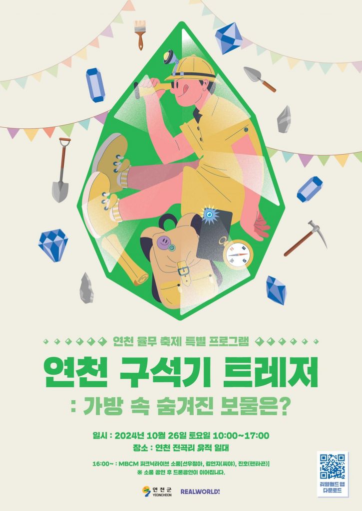 율무축제와 국화축제가 함께 열리는 전곡리 유적의 곳곳을 돌아보며 숨겨진 보물을 찾고, 연천과 관련된 퀴즈를 풀고, 연천농특산품을 비롯해 다양한 상품의 리워드를 획득하는 즐거움을 경험할 수 있다. 더불어 MBCM 라이브 소풍 공연[출연 선우정아, 김연지(씨야), 진호(펜타곤)] 및 축제의 밤을 아름답게 수놓을 드론 쇼로 축제의 즐거움을 배가시킬 예정이다.