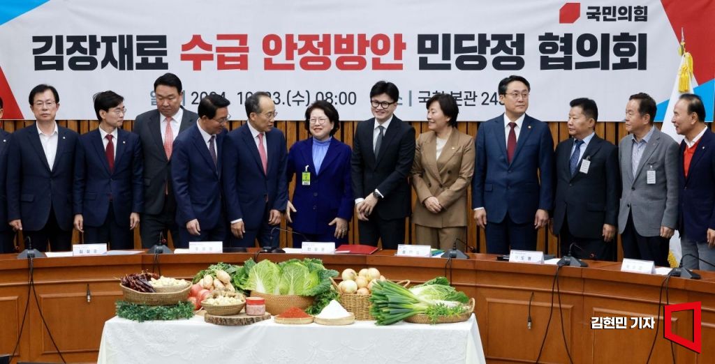 한동훈 국민의힘 대표와 추경호 원내대표, 송미령 농림축산식품부 장관과 강도형 해양수산부 장관, 남인숙 한국소비자단체협의회장 등이 23일 국회에서 열린 김장재료 수급 안정방안 민당정 협의회에서 기념촬영을 하고 있다.
