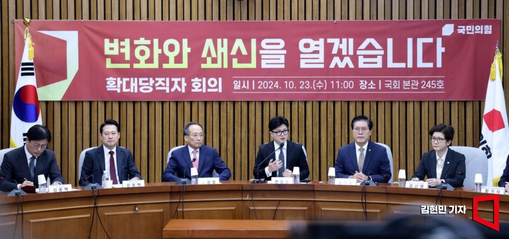 한동훈 국민의힘 대표가 23일 국회에서 열린 확대당직자회의에서 발언하고 있다. 사진=김현민 기자
