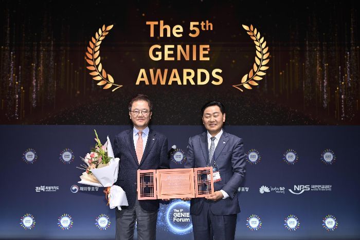 강석훈 산업은행 회장이 23일 전북 전주에서 개막한 ‘제5회 지니포럼(GENIE Forum)’에서 지역 신산업 혁신기업 발굴 및 육성과 경제 협력 네트워크 구축에 기여한 공로를 인정받아 올해의 ‘지니어워즈’를 수상했다.