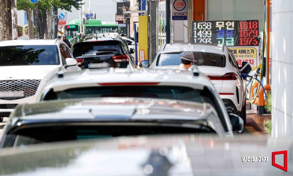정부가 유류세 인하 조치를 연말까지 두 달 연장하되 인하 폭을 일부 환원하기로 발표한 23일 서울 송파구에서 시민들이 주변 시세보다 저렴한 주유소를 찾아 주유를 하고 있다. 다음달부터 휘발유 유류세 인하 폭은 당초 20%에서 15%로, 경유는 30%에서 23%로 각각 축소된다.