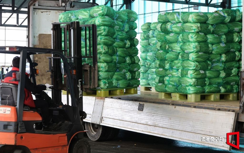 김장철을 앞두고 배추, 무 등 주요 김장재료 가격이 급등하고 있는 23일 서울 송파구 가락도매시장 채소집하장에 산지에서 올라온 배추가 내려지고 있다. 한국은행이 발표한 9월 생산자물가지수는 하락했지만 배추 등 농산물(5.7%) 가격은 올랐다.