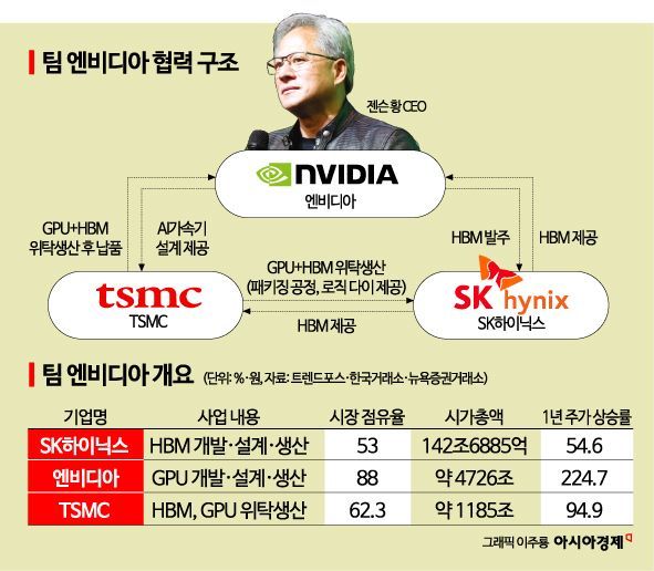 SK하이닉스가 3분기 역대 최대 실적을 거두면서 미국 엔비디아, 대만 TSMC로 구성된 '팀 엔비디아' 3각 동맹이 주목받고 있다. 엔비디아의 인공지능(AI)가속기와 SK하이닉스의 고대역폭메모리(HBM), 이를 패키징하는 TSMC의 협업이 강한 시너지 효과를 발휘하고 있기 때문이다. 빅테크 기업들이 AI 투자를 이어가겠다는 입장인 만큼 팀 엔비디아는 글로벌 AI 반도체 시장을 주도하며 승승장구할 것이라는 분석이 나온다.