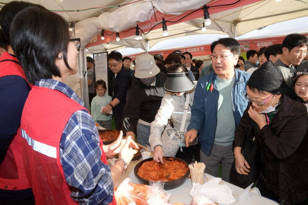지난 18~20일 광주시청 잔디광장에서 제31회 광주김치축제가 열린 가운데 강기정 광주시장이 김치를 판매하는 부스를 둘러보고 있다. [사진 제공=광주시]