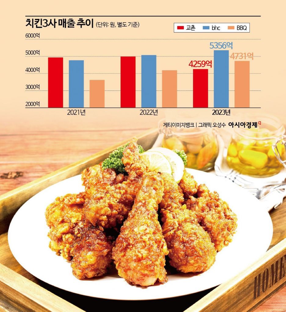 지난해 치킨3사의 매출은 별도 기준 bhc치킨 5356억, BBQ 4731억, 교촌 4259억원 순이었다. 현실적으로 1위와 2~3위의 격차가 크기 때문에 매출 왕좌가 바뀔 가능성은 거의 없어 보인다. 다만 2~3위 간 지각 변동은 있을 수 있다.