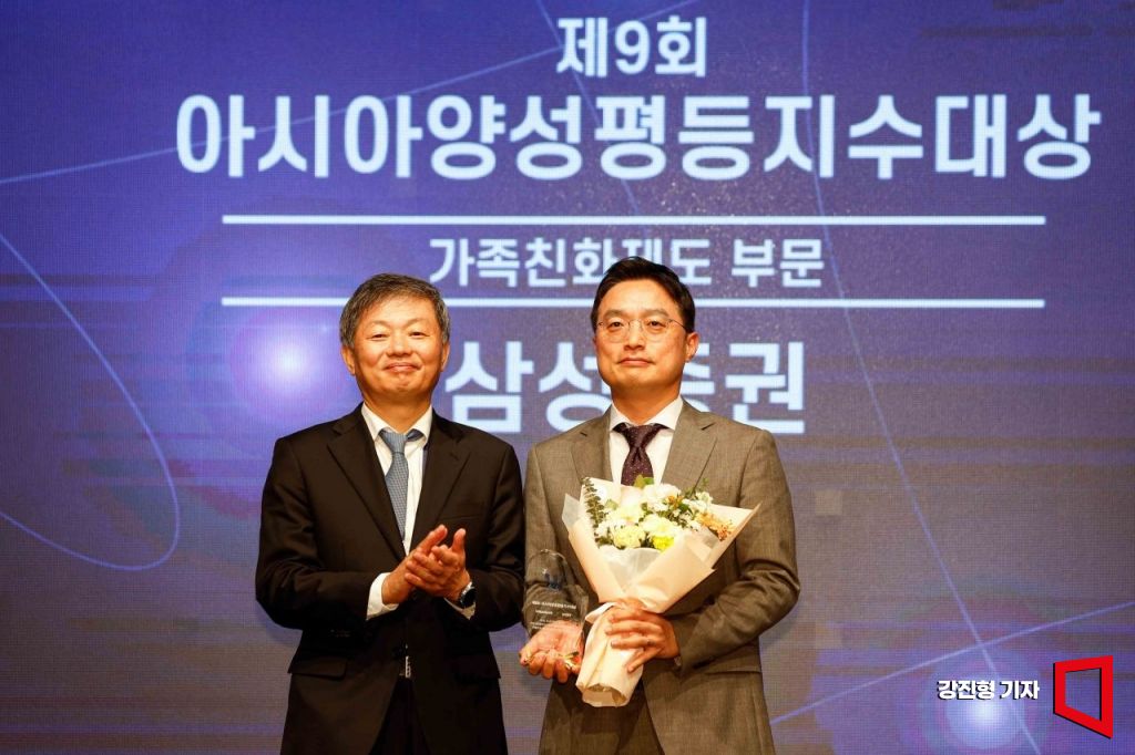 신우승 삼성증권 인사팀장이 30일 서울 중구 롯데호텔에서 아시아경제 주최로 열린 ‘제9회 아시아양성평등지수대상 시상식’에서 가족친화제도부문 아시아경제 대표상을 수상한 뒤 사진촬영 하고 있다. /사진=강진형 기자