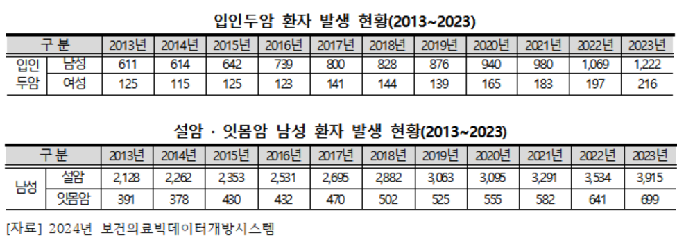 특히 두경부암 중 하나인 설암(혀, 혓바닥)과 잇몸암 남성 환자가 급증하면서 남성 설암 환자는 2013년 2128명에서 2023년 3915명으로, 남성 잇몸암 환자도 2013년 391명에서 2023년 699명으로 각각 2배 가까이 늘었다.