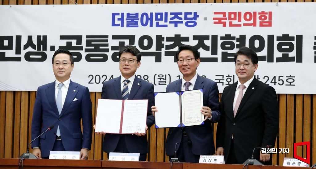 더불어민주당 박성준 원내수석부대표(왼쪽부터), 진성준 정책위의장과 국민의힘 김상훈 정책위의장, 배준영 원내수석부대표가 28일 국회에서 열린 민생·공통공약추진협의회 출범식에서 합의문을 들고 기념촬영을 하고 있다. 양당은 이번 협의회를 통해 반도체·AI·국가기간전력망 확충 등 미래 먹거리 창출 및 경제 재도약, 자산시장 밸류업(가치 제고), 중소기업·소상공인·자영업자 지원 및 골목상권과 지역경제 지원, 저출생 대응 및 지역 격차 해소, 국회의원 특권 폐지, 지구당 부활, 금투세 폐지 등과 관련된 법안을 논의한다.