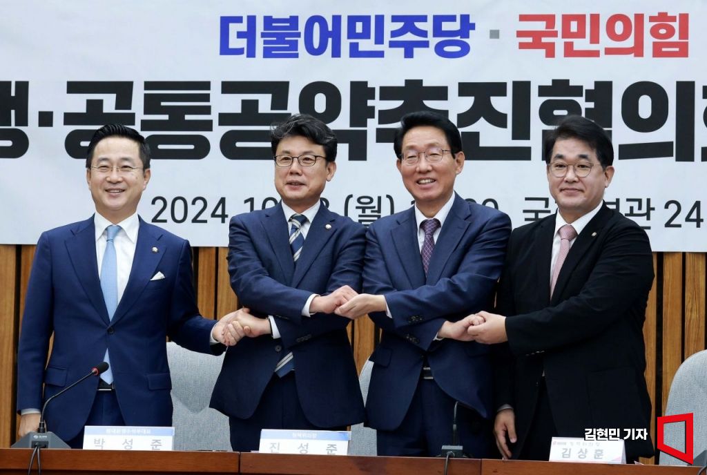 더불어민주당 박성준 원내수석부대표(왼쪽부터), 진성준 정책위의장과 국민의힘 김상훈 정책위의장, 배준영 원내수석부대표가 28일 국회에서 열린 민생·공통공약추진협의회 출범식에서 손을 맞잡고 있다. 양당은 이번 협의회를 통해 반도체·AI·국가기간전력망 확충 등 미래 먹거리 창출 및 경제 재도약, 자산시장 밸류업(가치 제고), 중소기업·소상공인·자영업자 지원 및 골목상권과 지역경제 지원, 저출생 대응 및 지역 격차 해소, 국회의원 특권 폐지, 지구당 부활, 금투세 폐지 등과 관련된 법안을 논의한다. 사진=김현민 기자