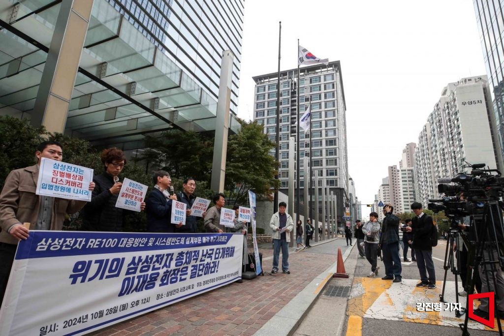 28일 서울 서초구 삼성전자 서초사옥 앞에서 경제민주화와양극화해소를위한99%상생연대 소속 관계자들이 삼성전자 RE100 대응방안 및 시스템반도체 설계부문 매각 촉구 기자회견을 하고 있다.