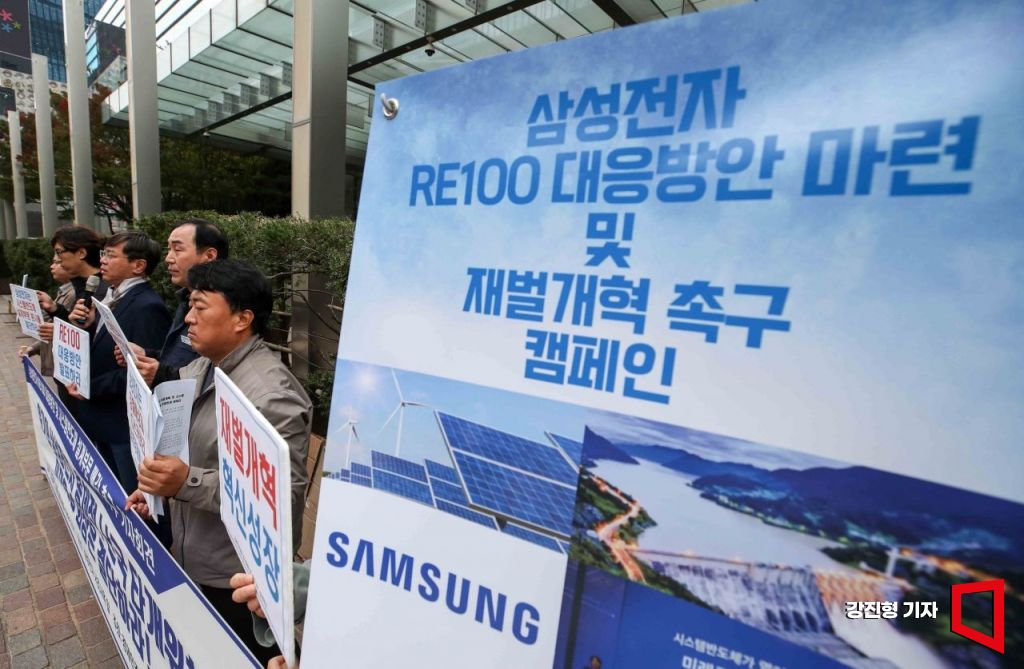 28일 서울 서초구 삼성전자 서초사옥 앞에서 경제민주화와양극화해소를위한99%상생연대 소속 관계자들이 삼성전자 RE100 대응방안 및 시스템반도체 설계부문 매각 촉구 기자회견을 하고 있다.