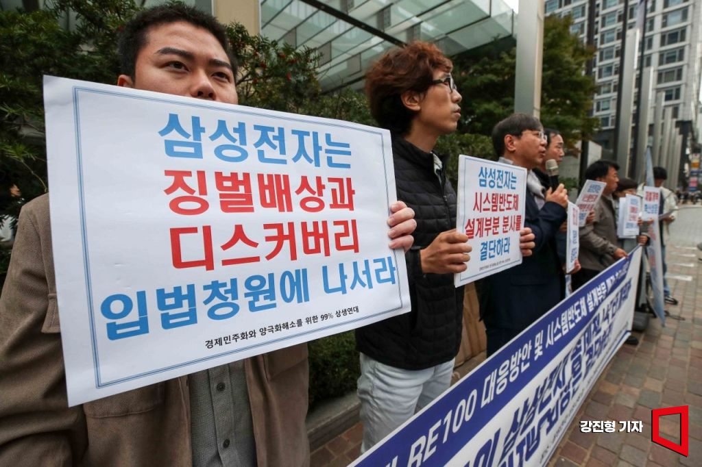 28일 서울 서초구 삼성전자 서초사옥 앞에서 경제민주화와양극화해소를위한99%상생연대 소속 관계자들이 삼성전자 RE100 대응방안 및 시스템반도체 설계부문 매각 촉구 기자회견을 하고 있다.