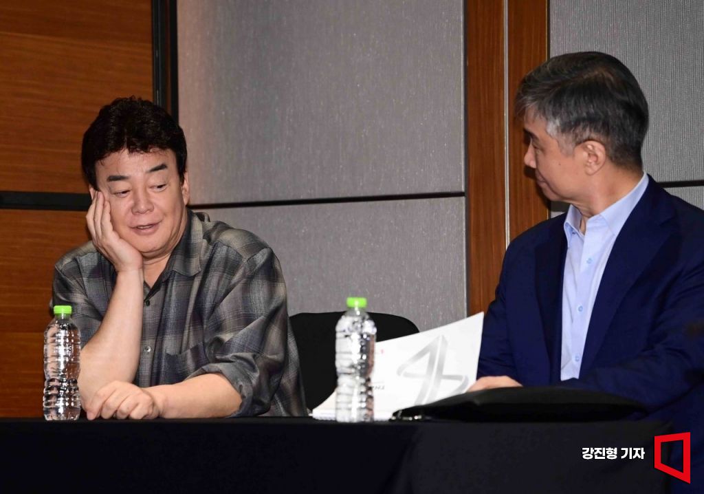백종원 더본코리아 대표가 28일 오후 서울 여의도 콘래드호텔에서 열린 더본코리아 IPO 기자간담회에 참석해 강석원 공동 대표와 이야기를 나누고 있다.