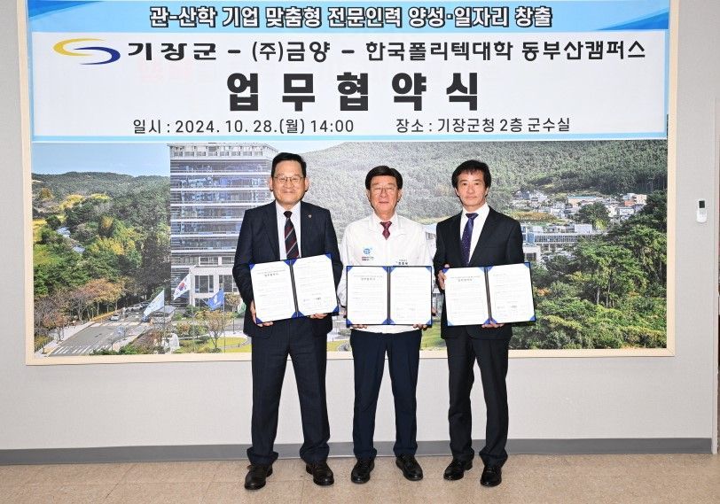 기장군(군수 정종복)은 28일 주식회사 금양(대표이사 류광지) 및 한국폴리텍Ⅶ대학 동부산캠퍼스(학장 이창열)와 ‘기업 맞춤형 전문인력 양성을 통한 일자리 창출 업무협약(MOU)’을 체결했다.