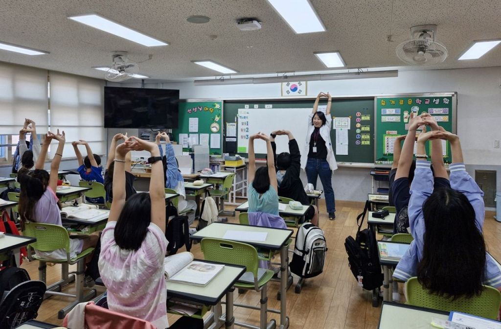 남양주시는 지난 5월부터 관내 초등학교 5학년 아동을 대상으로 ‘초등학생 척추측만증 조기검진사업’을 마무리했다. 사진은 교사가 어린이들에게 바른자세 운동프로그램을 지도하고 있는 모습. <사진=남양주시>