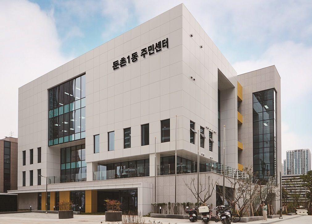 옛 둔촌주공아파트 단지 내에 위치했던 둔촌1동주민센터는 주택재건축정비사업 추진에 따라 2018년 둔촌2동 주민센터로 이전 후 임시사무소로 운영돼왔다. 이번에 조성된 둔촌1동 주민센터 신축청사는 정비사업으로 기부채납된 시설 중 하나로, 지난해 6월 착공 후 올해 10월에 준공됐다.