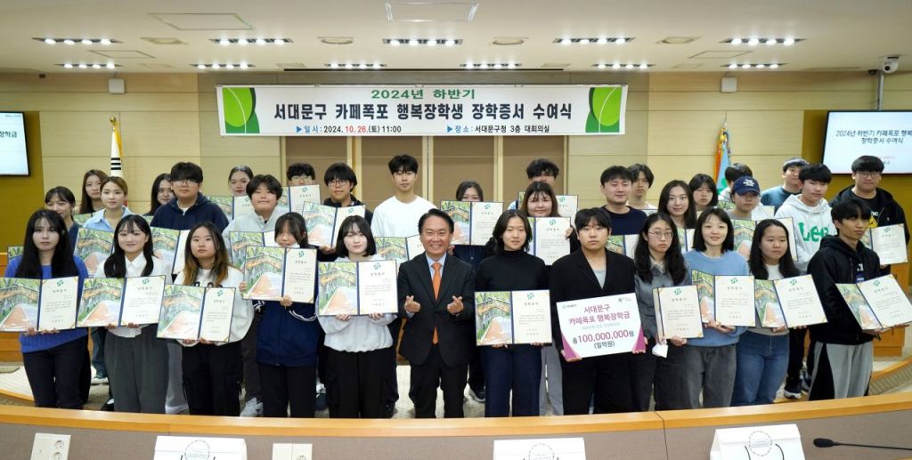 서울 서대문구(구청장 이성헌)는 올해 하반기 ‘서대문구 카페폭포 행복장학생’ 54명을 최근 선발하고 이들에게 총 1억원의 장학금을 전달했다고 30일 밝혔다.