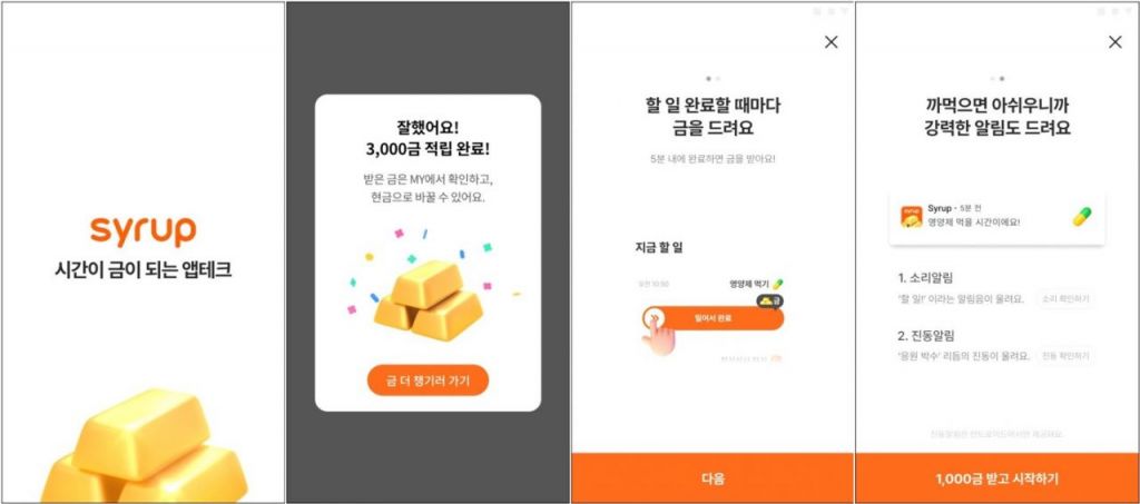 서비스를 처음 경험하는 사용자를 위한 특별 혜택도 준비했다. 시럽 회원 최초 인증 시(3000금), 모으기탭 최초 알림 설정 시(1000금), 지금 할 일 첫 등록 시(1000금) 추가 혜택을 제공한다.