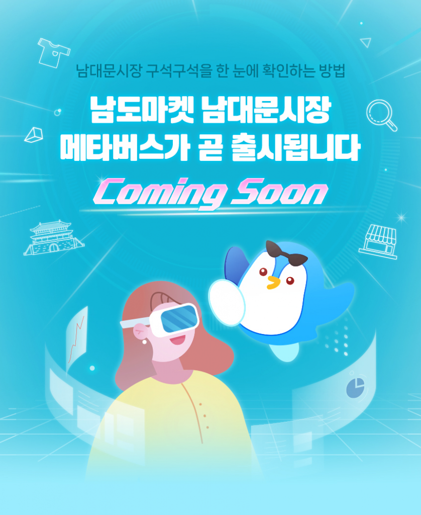 남도마켓은 오는 11월 1일 비즈니스, 관광 목적으로 방문하는 국내외 방문객이 남대문시장을 더욱 잘 즐길 수 있도록 ‘남대문시장 메타버스’를 오픈할 예정이다. 남도마켓 홈페이지 상단 ‘메타버스’를 클릭하면 입장할 수 있다.