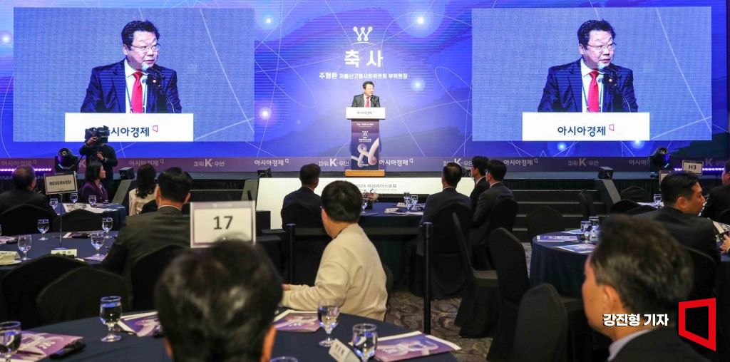 주형환 저출산고령사회위원회 부위원장이 30일 서울 중구 롯데호텔에서 아시아경제 주최로 열린 ‘2024 여성리더스포럼’에 참석해 축사 하고 있다.