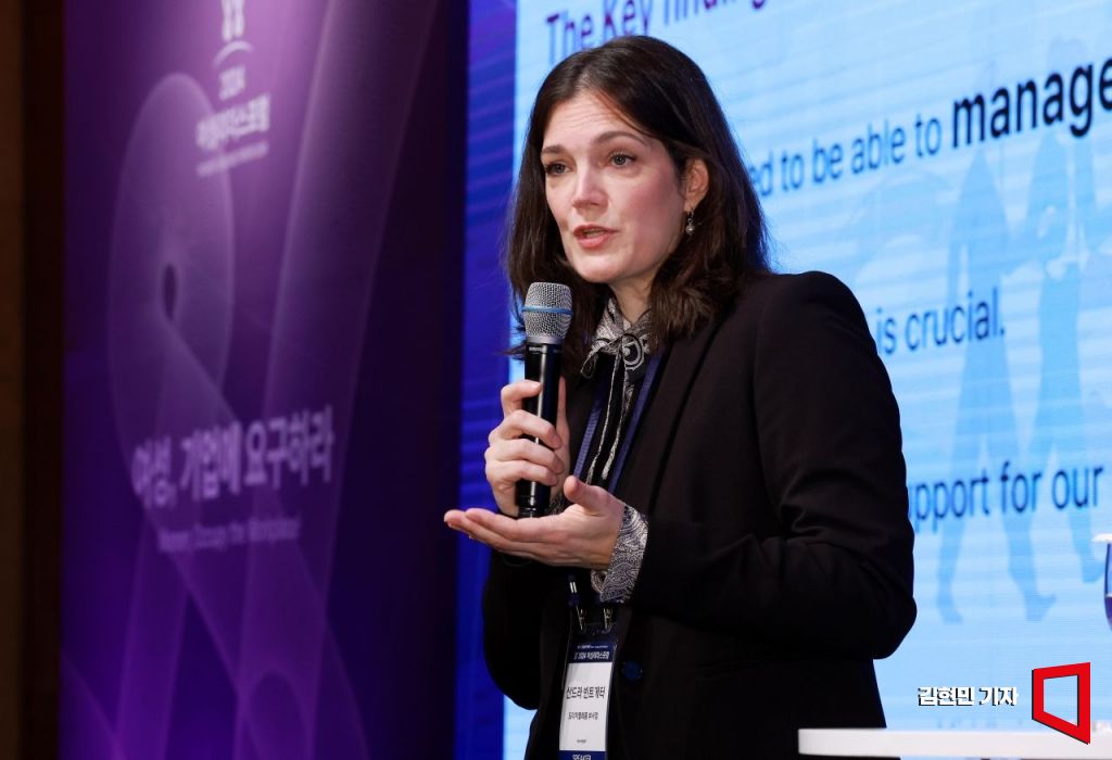 산드라 빈트게터 도이치텔레콤 부사장이 30일 서울 소공동 롯데호텔에서 아시아경제 주최로 열린 2024 여성리더스포럼에서 '독일 최대 통신사는 왜 육아휴직자를 아르바이트로 쓰나'를 주제로 기조강연을 하고 있다. 김현민 기자