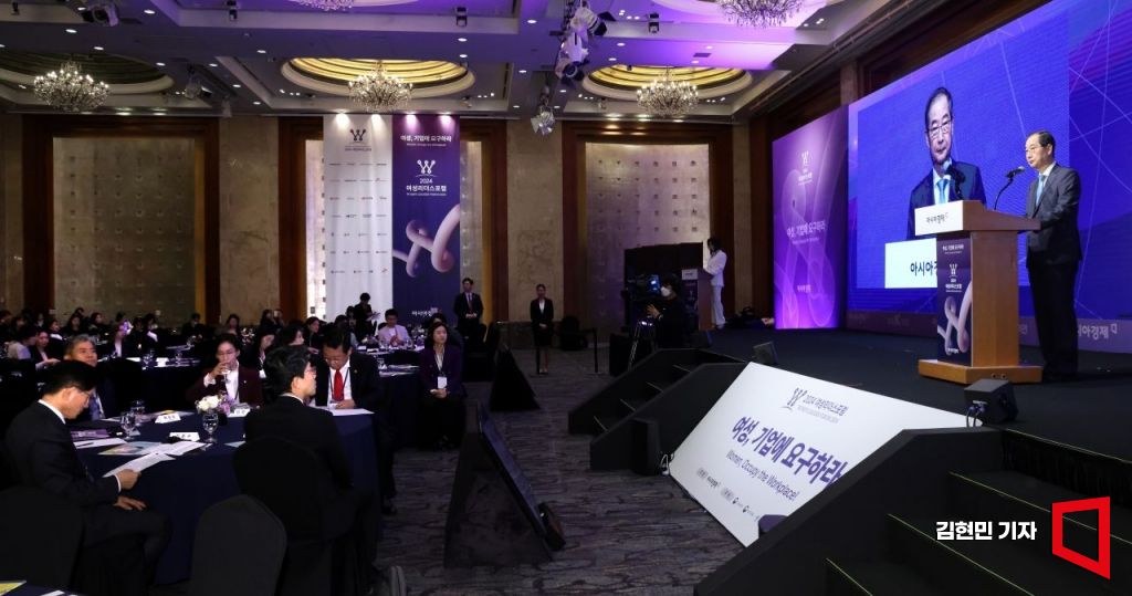 한덕수 국무총리가 30일 서울 중구 롯데호텔에서 아시아경제 주최로 열린 2024 여성리더스포럼에서 축사하고 있다.