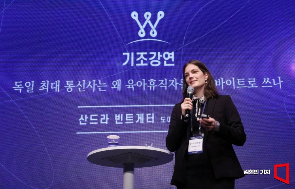 산드라 빈트게터 도이치텔레콤 부사장이 30일 서울 중구 롯데호텔에서 아시아경제 주최로 열린 2024 여성리더스포럼에서 '독일 최대 통신사는 왜 육아휴직자를 아르바이트로 쓰나'를 주제로 기조강연을 하고 있다.