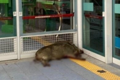 멧돼지에 오른팔을 물린 남성은 급히 병원으로 옮겨졌고 4층 도시철도 고객센터 유리문은 부서졌다.