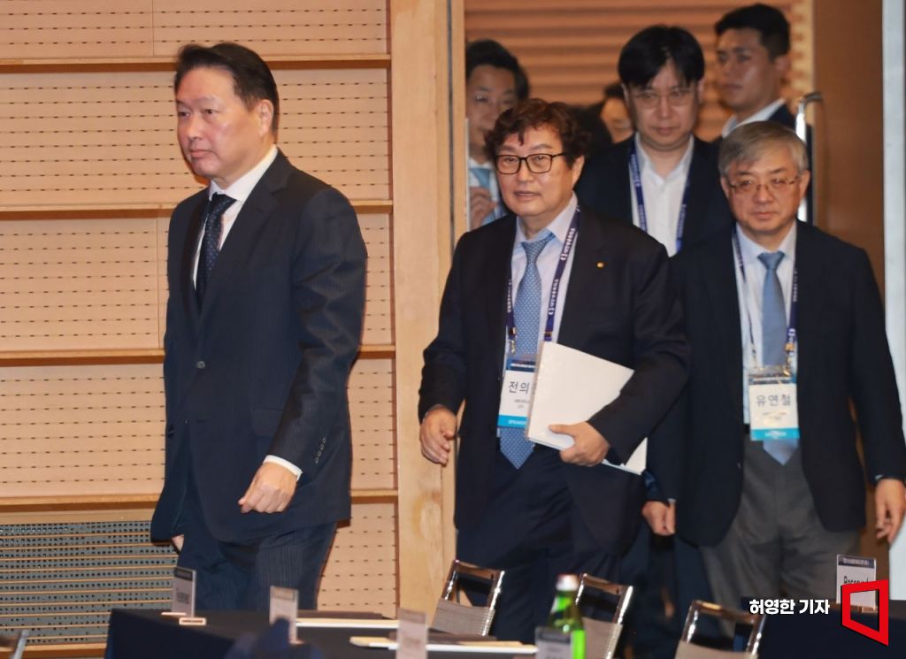 대한상공회의소 주최로 30일 대한상의 국제회의실에서 열린 2024 탄소중립과 에너지 정책 세미나에 참석하기 위해 최태원 회장과 발표자들이 회의실로 들어서고 있다.