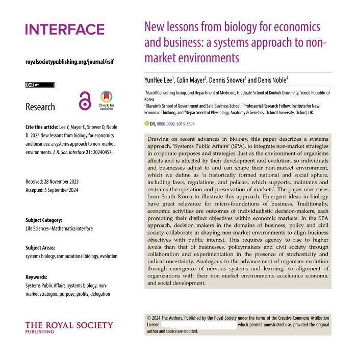 옥스포드대학의 사이드 경영대학원(Said Business School)의 학장을 지내기도 했던 저명 경영학자 콜린 메이어 교수와 시스템 생물학의 창시자이며 수차례 노벨상 후보에 올랐던 데니스 노블 교수는 “경제학에서 시장과 경쟁에 중점을 두었던 기존의 기초가 현재 진행 중인 생물학적 개념의 근본적인 재구성으로 인해 크게 흔들리고 있다”면서 “논문은 기업들이 참고할 명확한 지침을 제시하는데 시스템 공공정책(SPA)은 기업들이 시장 및 비시장 환경의 급속한 변화에 맞춰 스스로의 진화를 조정할 수 있는 방향성을 제공한다"고 의미를 설명했다.