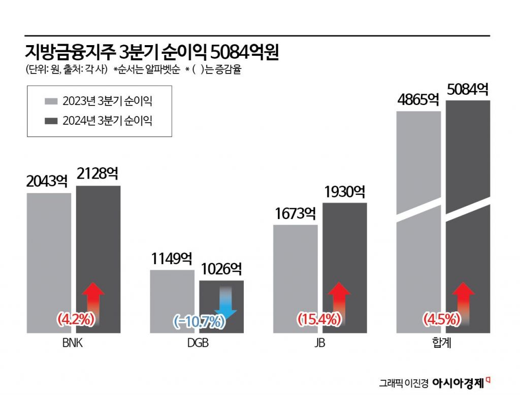 30일 금융권에 따르면 지방금융지주의 올해 3분기 합산 순이익은 5084억원이다. 지난해 3분기(4865억원)에 비해 4.5% 증가한 수치다. 이자이익과 비이자이익 모두 성장했으나 특히 비이자이익이 크게 늘었다. 3개 사의 합산 이자이익은 3분기 기준 1조6568억원으로 지난해 3분기 1조6344억원보다 1.37% 증가했다. 비이자이익의 경우 지난해 3분기 1808억원보다 10.8% 늘어난 2003억원을 기록했다.
