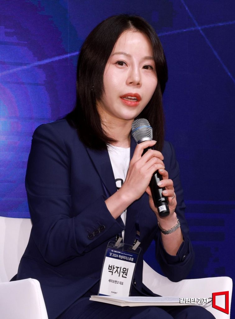 박지원 세이브앤코 대표가 30일 서울 중구 롯데호텔에서 아시아경제 주최로 열린 2024 여성리더스포럼에서 '도전과 성장 - 스타트업 CEO의 한 발 더 내딛는 용기'를 주제로 패널 토론을 하고 있다.