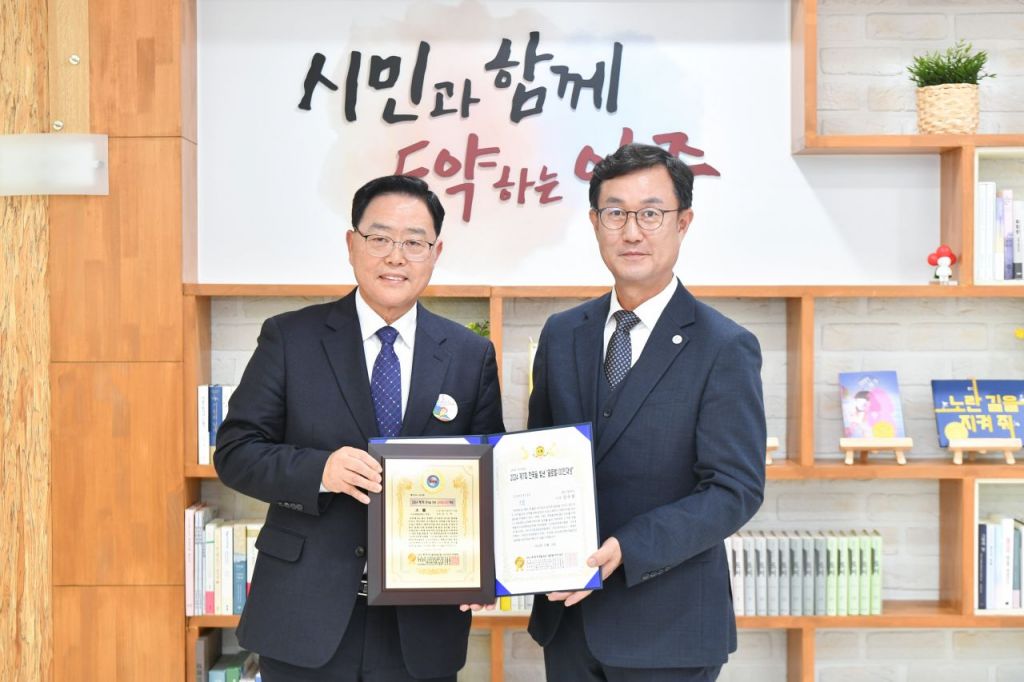 30일 오후 시청 2층 집무실에서 우중식 경기도체육회 이사가 강수현 양주시장에게 상패를 전달하고 있는 모습이다.