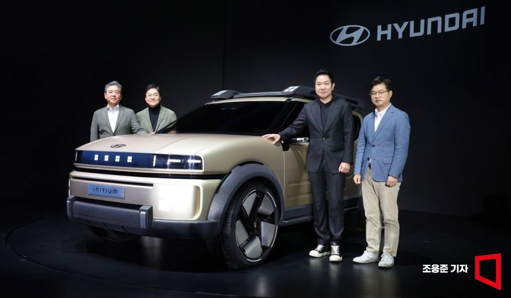 장재훈 현대자동차 사장(왼쪽), 이상엽 부사장(오른쪽 두번째) 등 개발임원들이 31일 경기도 현대모터스튜디오 고양에서 수소전기차 콘셉트카 ‘이니시움(INITIUM)’을 최초로 공개하고 있다.