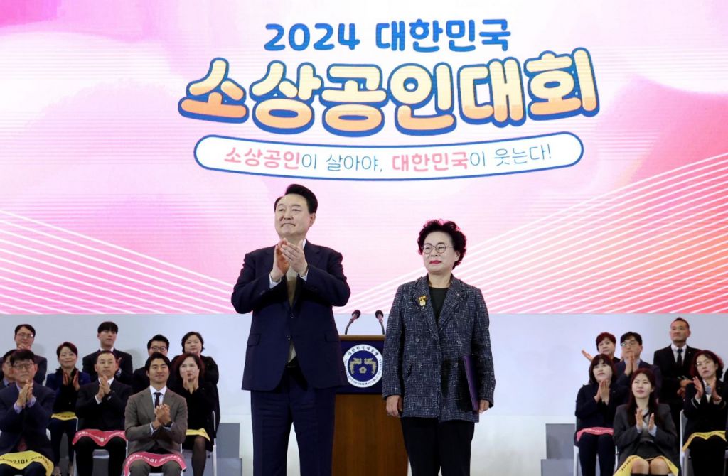 윤석열 대통령이 31일 경기도 고양시 킨텍스에서 열린 '2024 대한민국 소상공인대회 개막식'에서 라복임플로체 라복임 대표에게 대통령 표창을 수여한 뒤 박수치고 있다. [이미지출처=연합뉴스]