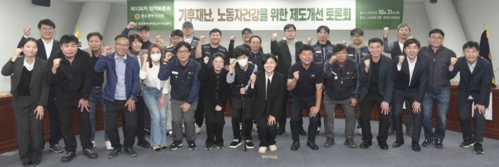 최지현 광주시의회 의원(더불어민주당, 광산1)은 31일 시의회 예산결산특별위원회실에서 ‘기후 재난 및 노동자 건강을 위한 제도개선 토론회’를 개최했다. 광주시의회와 광주전남노동안전보건지킴이(준)가 공동 주최한 이 날 토론회에서는 기후변화로 인한 노동자 안전 문제와 제도적 개선 방안이 논의됐다.