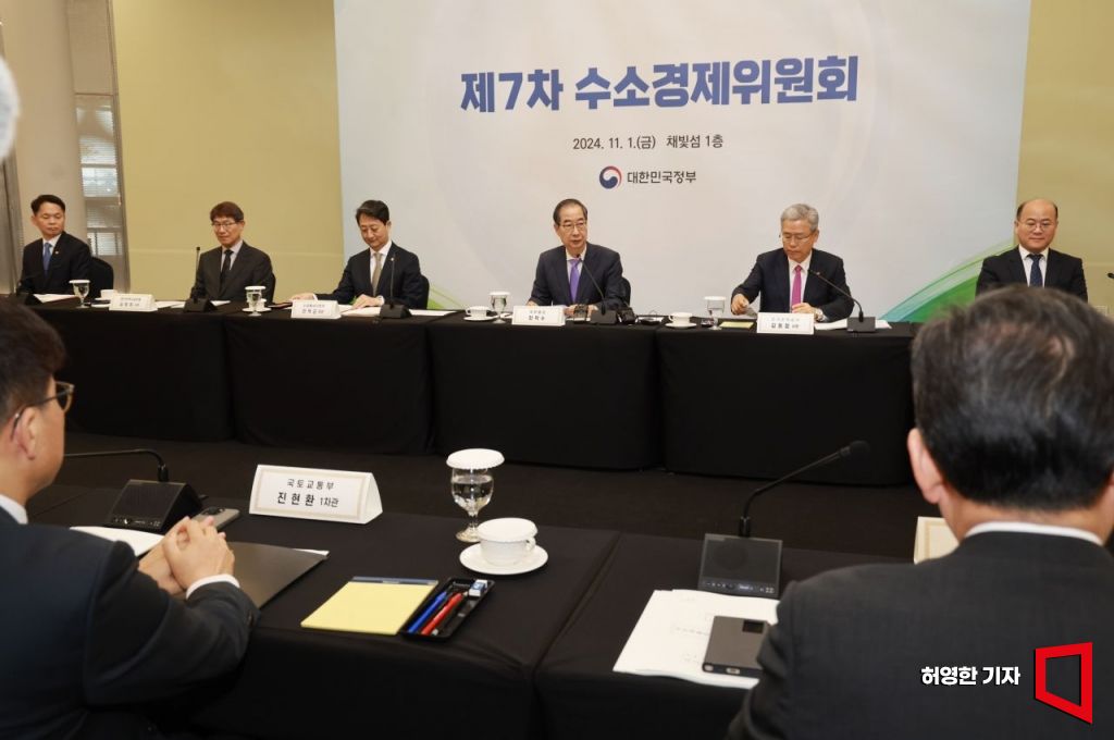 제7차 수소의 날을 하루 앞둔 1일 서울 채빛섬에서 열린 제7차 수소경제위원회에서 한덕수 국무총리가 모두발언을 하고 있다.