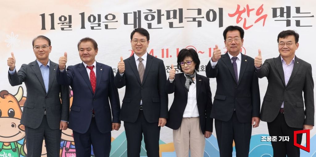 1일 서울 하나로마트 양재점 특별행사장에서 열린 대한민국이 한우먹는 날 개막식에서 박철진 농협경제지주 축산지원본부장, 이동활 한우자조금관리위원장, 김정욱 농림축산식품부 축산정책관, 허명 한국여성단체협회장, 민경천 전국한우협회 회장, 이동근 농협유통 대표(왼쪽부터) 등 참석자들이 한우 최고 퍼포먼스를 하고 있다.