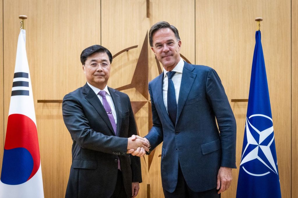홍장원 국정원 제1차장이 지난달 28일(현지시간) 벨기에 브뤼셀 나토 본부에서 마르크 뤼터 나토 사무총장과 회동 뒤 기념사진을 촬영하고 있다. 연합뉴스
