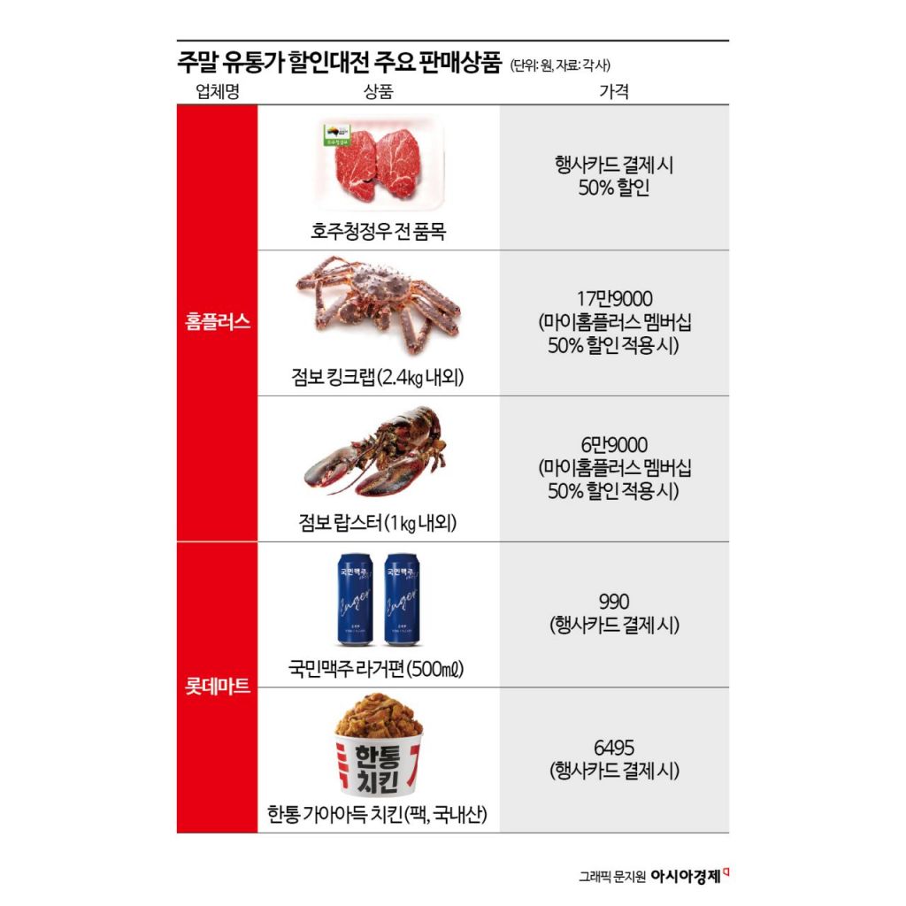 7일부터 13일까지 진행되는 홈플러스의 메가푸드위크 2주차 행사에서는 호주산 소고기와 킹크랩, 랍스터가 대표 상품입니다. 호주청정우 전 품목은 행사 카드로 결제하면 최대 반값에 살수 있습니다. 스테이크용 안심과 구이용 척아이롤, 특수부위 안창살, 토시살 등 호주청정우 전품목이 행사 대상입니다.