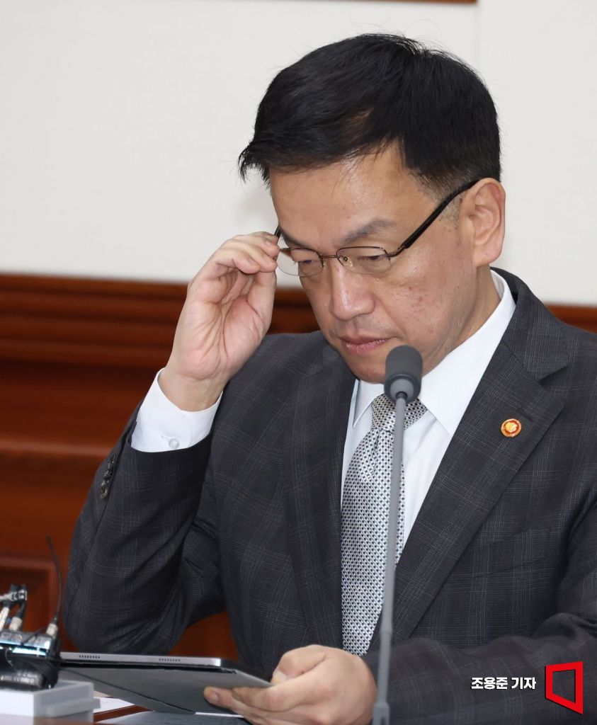 최상목 경제부총리 겸 기획재정부 장관이 7일 정부서울청사에서 열린 경제관계장관회의 겸 대외경제장관회의에 참석해 자료를 살피고 있다. 이날 회의에서는 미 대선 결과 대응 및 한-미 주요 통상 현안 대응 방안에 대한 논의가 진행됐다.
