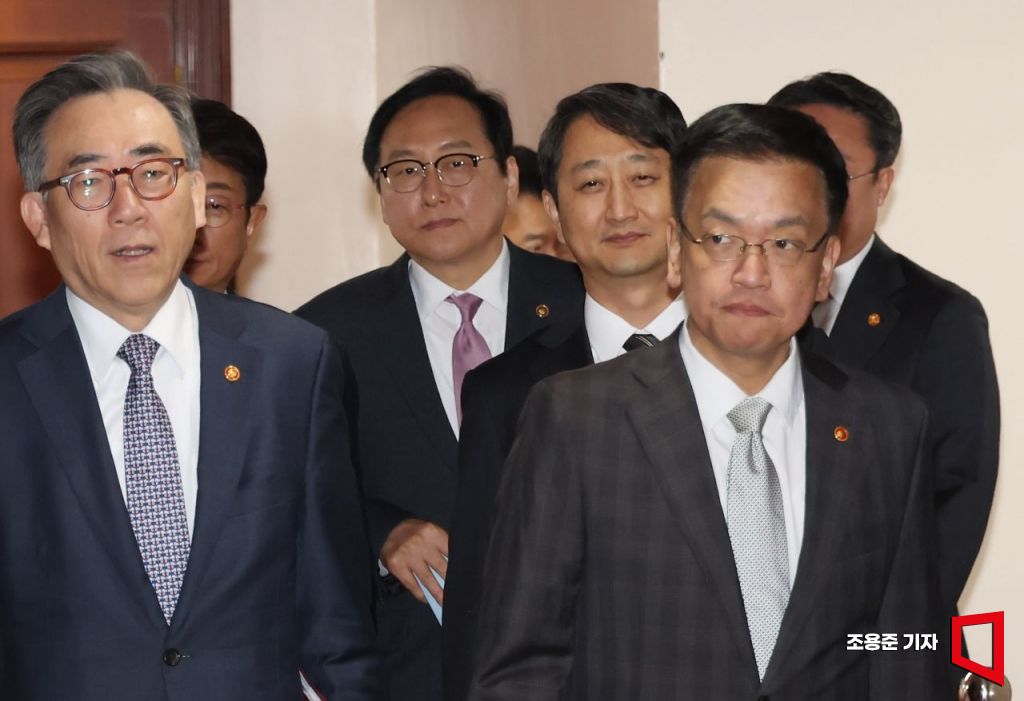 최상목 경제부총리 겸 기획재정부 장관을 비롯한 국무위원들이 7일 정부서울청사에서 열린 경제관계장관회의 겸 대외경제장관회의 참석을 위해 회의실로 향하고 있다. 이날 회의에서는 미 대선 결과 대응 및 한-미 주요 통상 현안 대응 방안에 대한 논의가 진행됐다.