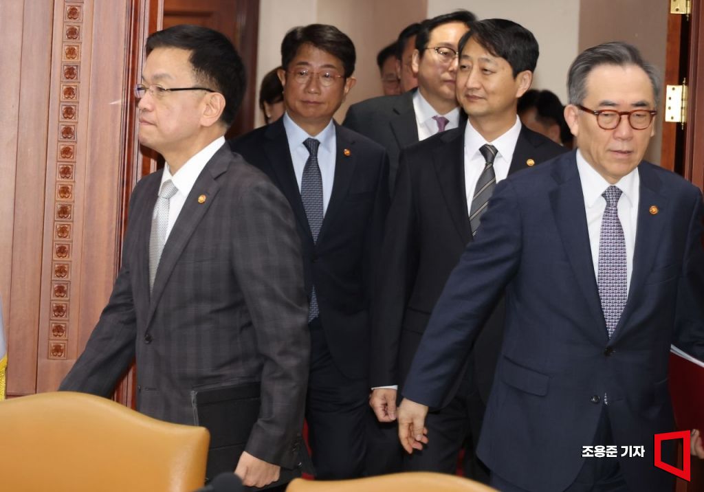 최상목 경제부총리 겸 기획재정부 장관을 비롯한 국무위원들이 7일 정부서울청사에서 열린 경제관계장관회의 겸 대외경제장관회의 참석을 위해 회의실로 향하고 있다. 이날 회의에서는 미 대선 결과 대응 및 한-미 주요 통상 현안 대응 방안에 대한 논의가 진행됐다.
