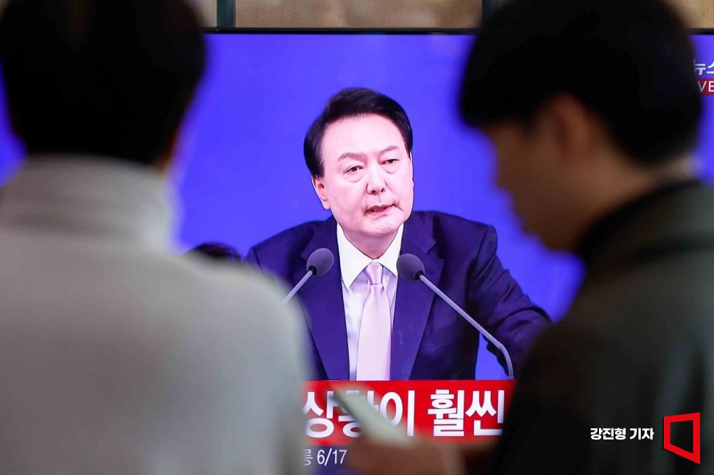 7일 서울 용산구 서울역 대합실에서 윤석열 대통령의 대국민 담화가 중계되고 있다. 대통령실은 대국민담화 뒤 기자회견에서 시간이 길어지더라도 질문이 더 나오지 않을 때까지 질의응답을 이어가겠다고 밝혔다.
