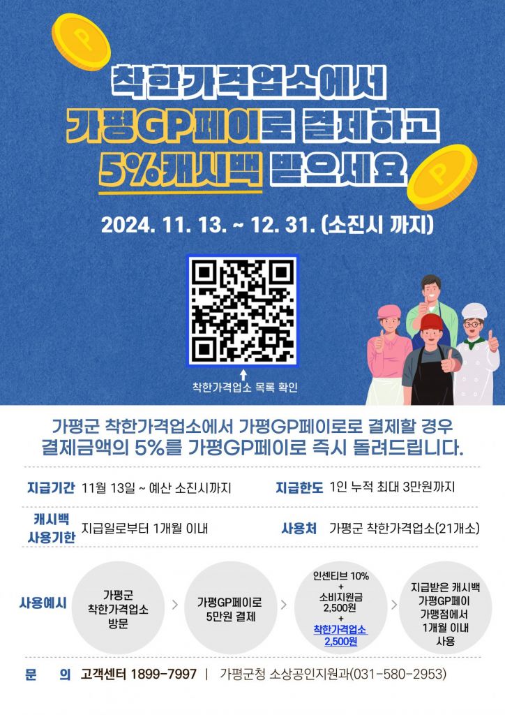 현재 운영 중인 가평GP페이는 기존 10% 인센티브를 지급하고 있는데, 이번 행사 기간 동안 착한가격업소에서 결제할 경우 추가로 5% 캐시백 혜택을 받을 수 있다. 이 혜택은 11월 1일부터 진행 중인 소비지원금 행사와 중복으로 진행된다.
