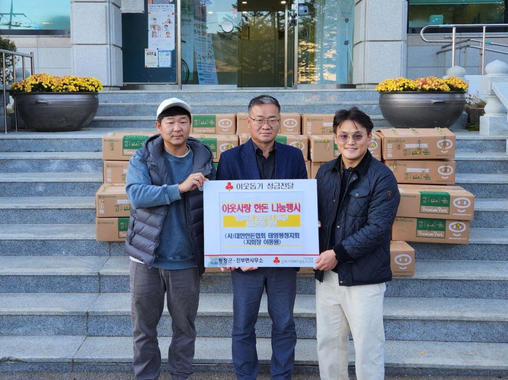 강원특별자치도 평창군(군수 심재국)은 8일, 대한한돈협회 태영평정지회(지부장 이동원)가 7일 진부면사무소에서 600만 원 상당의 냉동 목심(한돈) 375kg을 전달했다고 밝혔다.